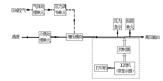 液體增壓單元是根據(jù)用戶的實際需求設(shè)計的一種新型試壓裝置,,主要的作用是能夠控制設(shè)備的啟停,可針對于不同的測試壓力,進行計算機設(shè)定,可實現(xiàn)到壓力自動停機,實時觀察測試數(shù)據(jù),輸出測試報告,設(shè)備根據(jù)客戶的要求添加了強制性手動泄壓閥,可針對于測試過程中出現(xiàn)的意外進行強制性泄壓,系統(tǒng)工作原理及流程如圖所示。